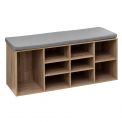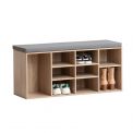 Práctico banco fabricado en MDF con varios huecos en los que podrás colocar cualquier tipo de objetos, teniendo en su parte central unos destinados a los zapatos; hasta un total de 8 pares.
